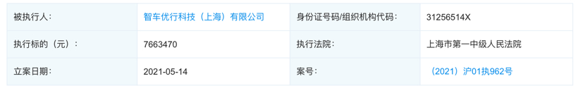 5月18日,据企查查信息显示,奇点汽车关联公司智车优行科技(上海)有限公司新增一条被执行人信息,案号(2021)沪01执962号,执行标的766.35万元,执行法院为上海市第一中级人民法院。