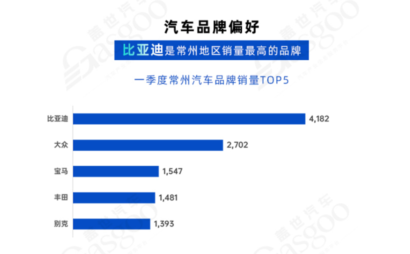 比亚迪品牌最受欢迎。常州地区品牌销量TOP5分别是比亚迪、大众、宝马、丰田、别克。在品牌销量排名前五名中,比亚迪品牌以0.4万辆位居常州地区一季度销量第一名。比亚迪品牌如此受欢迎主要得益于强大的新能源品牌口碑传播、产品极致性价比,以及绝对的本土优势。