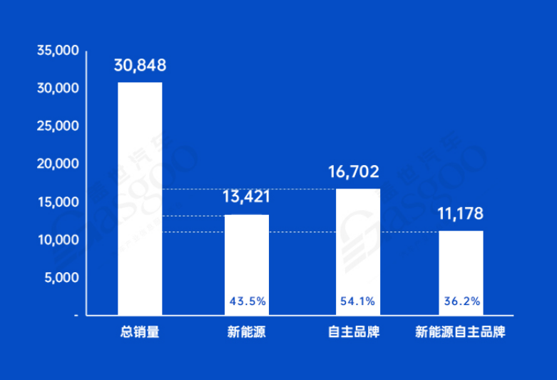 根据生态车旅图研究院终端数据整理,常州地区2024年1-3月乘用车终端销量为3.1万辆。其中,新能源乘用车销量为1.3万辆,占比为43.5%。自主品牌是推动新能源销量增长的绝对主力。一季度,自主品牌在常州地区新能源销量为1.1万辆,占整体市场份额的36.2%。自主品牌新能源对常州新能源销量的贡献率为83.3%。