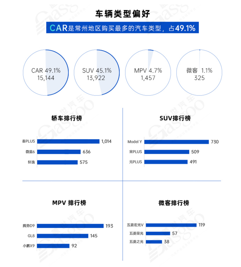 轿车是常州地区购买最多的汽车类型。2024年1-3月常州地区轿车销量1.5万辆,销量占比49.1%,SUV销量1.4万辆,销量占比45.1%。在轿车车型中,常州消费者最喜欢的车型是比亚迪秦PLUS、别克微蓝6和日产轩逸。SUV车型中,消费者更偏好特斯拉Model Y、比亚迪宋PLUS和比亚迪元PLUS。在MPV车型中,腾势D9、别克GL8和小鹏X9最受欢迎。