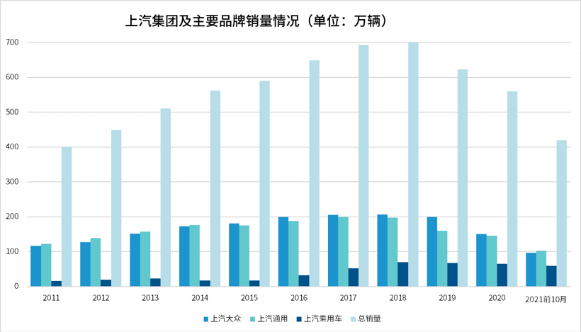 但其实,上汽的焦虑并不仅仅止于此。虽然从整体销量来看,上汽集团已经连续15年保持国内第一,目前上汽所面临的竞争形势远没有销量数据上看到的那么风光。尤其自2019年以来,随着宏观车市的持续低迷,上汽的整体销量也出现了较大幅度的下滑。到2020年底,上汽的销量已经跌回2014年的水平,这背后两大合资车企——上汽大众和上汽通用销量双双大幅下跌是主要原因。