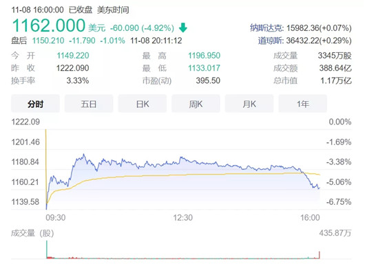 殊不知,美国东部时间11月8日,特斯拉股价盘前一度大跌近10%,换手率激增,超过290万次。最终,截至收盘其每股股价报收于1162.000美元,跌幅达到4.92%,总市值也回落到1.17万亿美元。