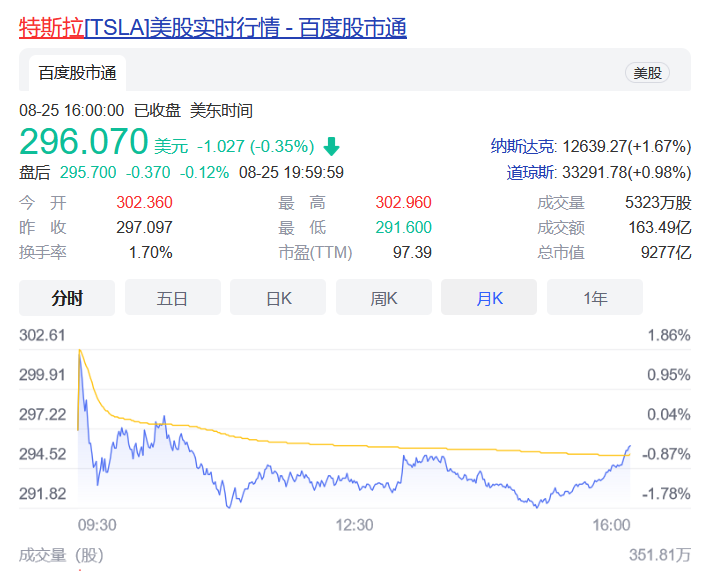 而根据百度股市通的最新数据,8月25日,特斯拉开盘价为302美元,收盘价为296.07美元,收盘下跌2%,市值达到9,277亿美元,再度接近1万亿美元。
