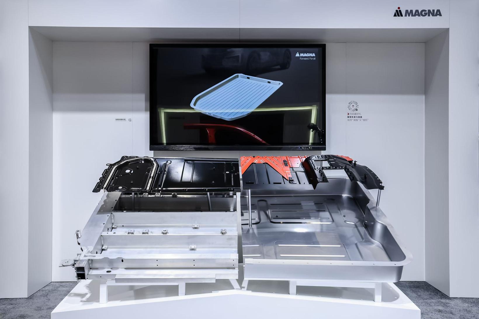 麦格纳在车展现场所展示的电池壳体采用创新的一体成型钢或铝材设计,以确保最佳的性能和安全性。据介绍,麦格纳自 2011 年起生产电池壳体,最初用于混合动力系统,而从 2022 年起,开始生产适用于纯电动汽车的整套电池壳体系统。近乎矩形的圆角和侧壁的一体式钢制电池托盘,将可用电池空间增加了6%,重量比同类设计轻20%,同时提高了密封性。